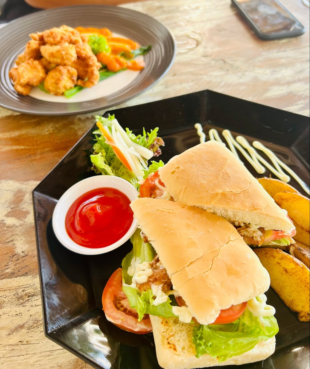 Amazing place to eat. More variety, not only Mie/Nasi Goreng… We had crispy calamari as a starter. Good portion, very fresh and rich taste. As main course we had the BBQ Thai Style Pork. A bit unique (in a good way). Maybe portion could be a little bit more. We also had the Thai Crispy Chicken in Sweet-sour chili sauce which was absolutely delicious. 75k each is okay to me because the higher price results in way higher quality compared to warungs, and that you can taste. As dessert the baked banana with coconut icecream in condiment was also a tasteful conclusion. Staff has great finesse, pays attention to guests. Perfect table preparation also, you see this attention to detail very rarely around here.